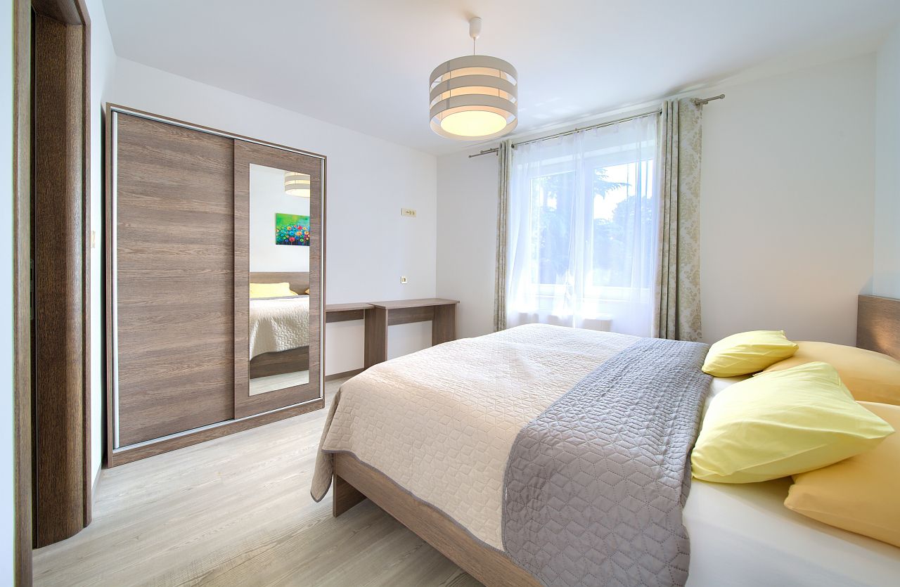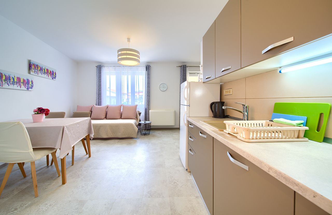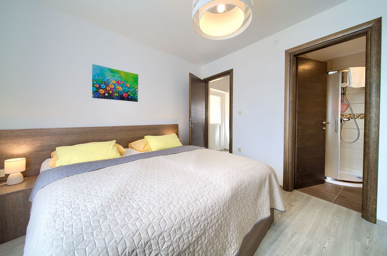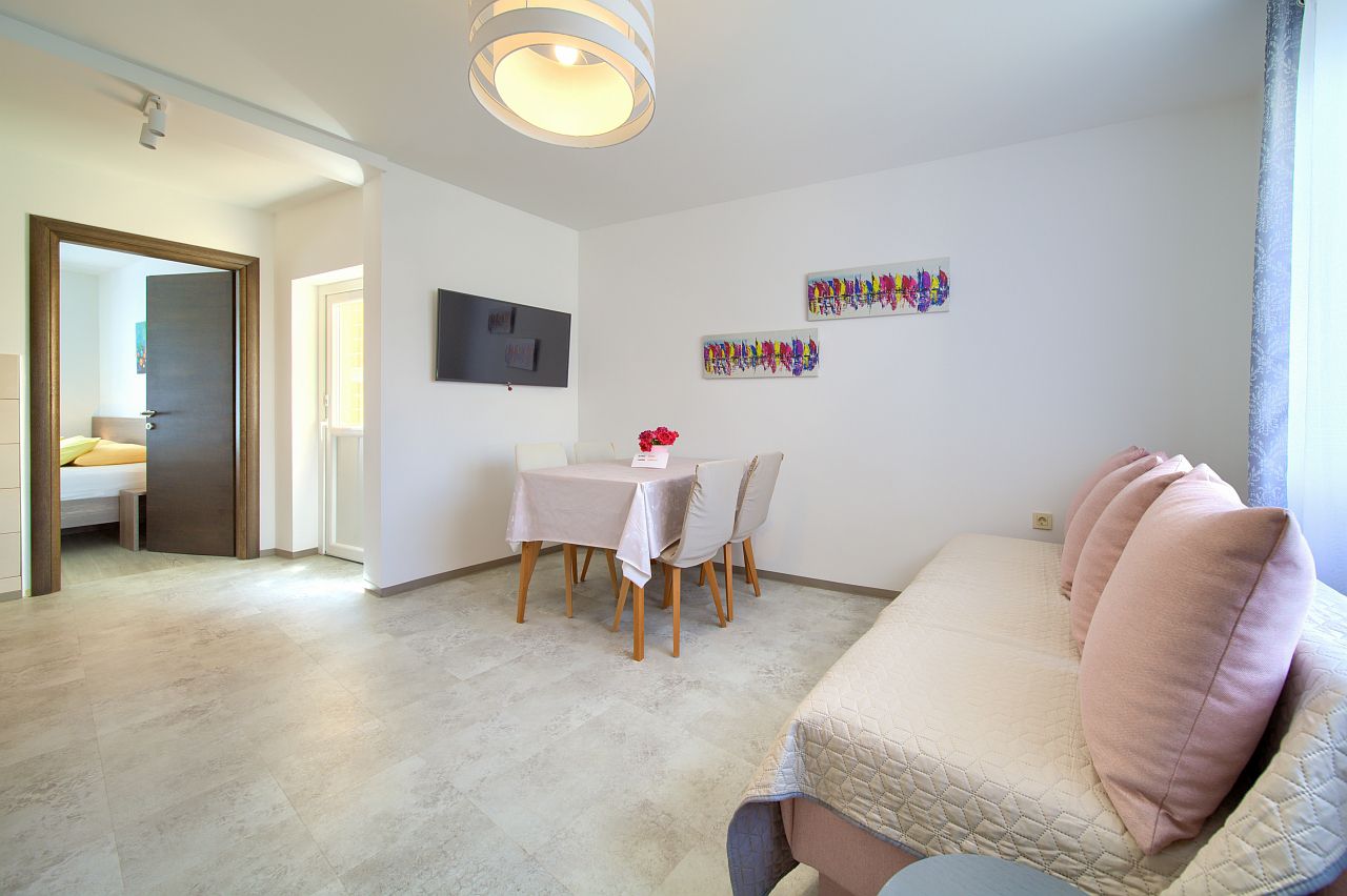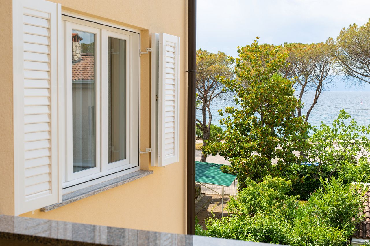 The apartment of 45m2, is located on the 1st floor. It has a bedroom with double bed and bathroom, equipped kitchen, living room, main bathroom and a terrace facing the sea. In the living room there is an extra bed for two people.