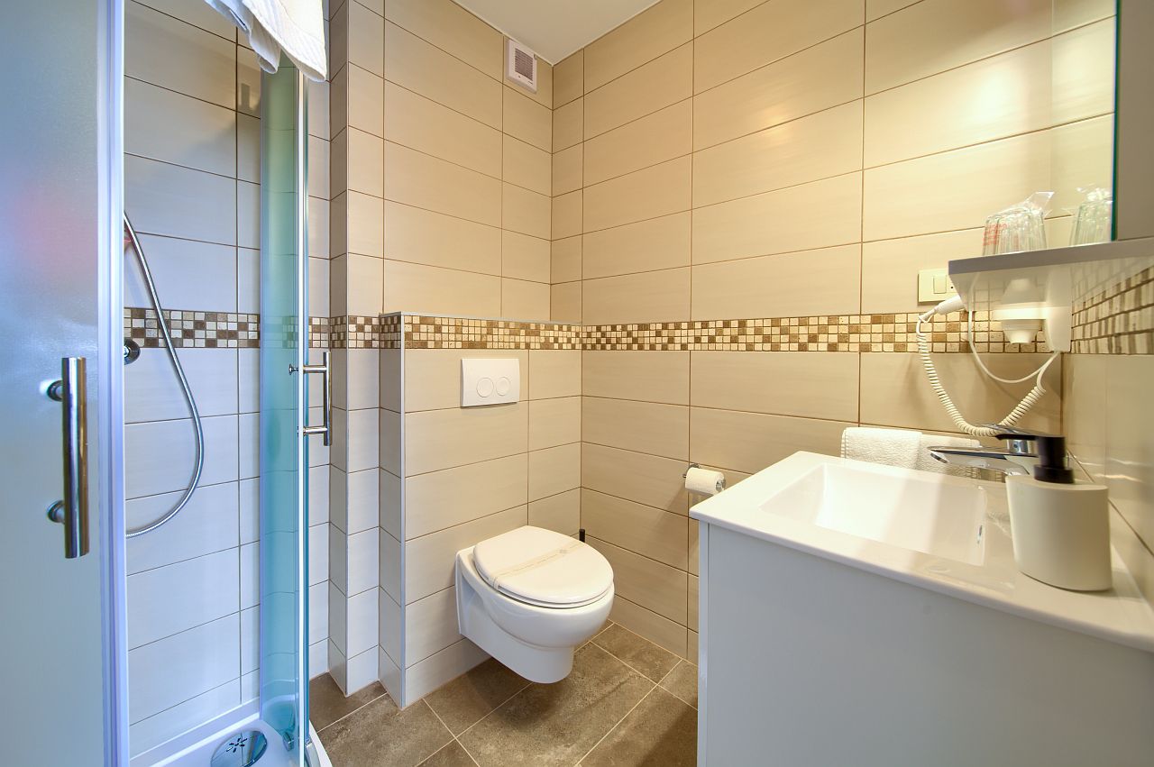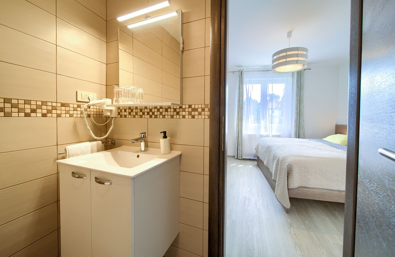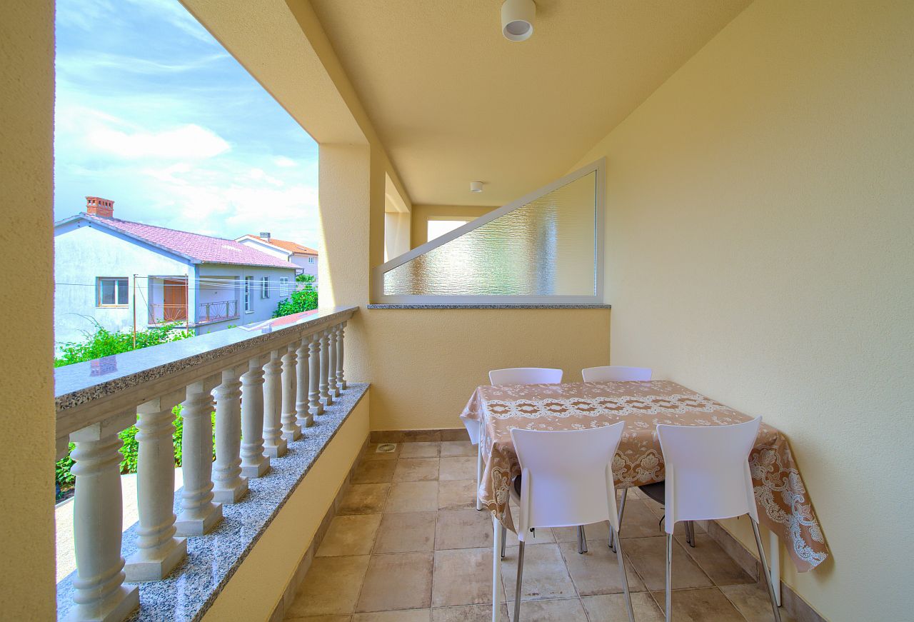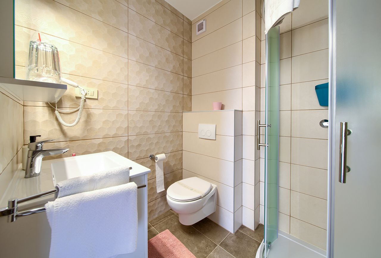 The apartment of 45m2, is located on the 1st floor. It has a bedroom with double bed and bathroom, equipped kitchen, living room, main bathroom and a terrace facing the sea. In the living room there is an extra bed for two people.
