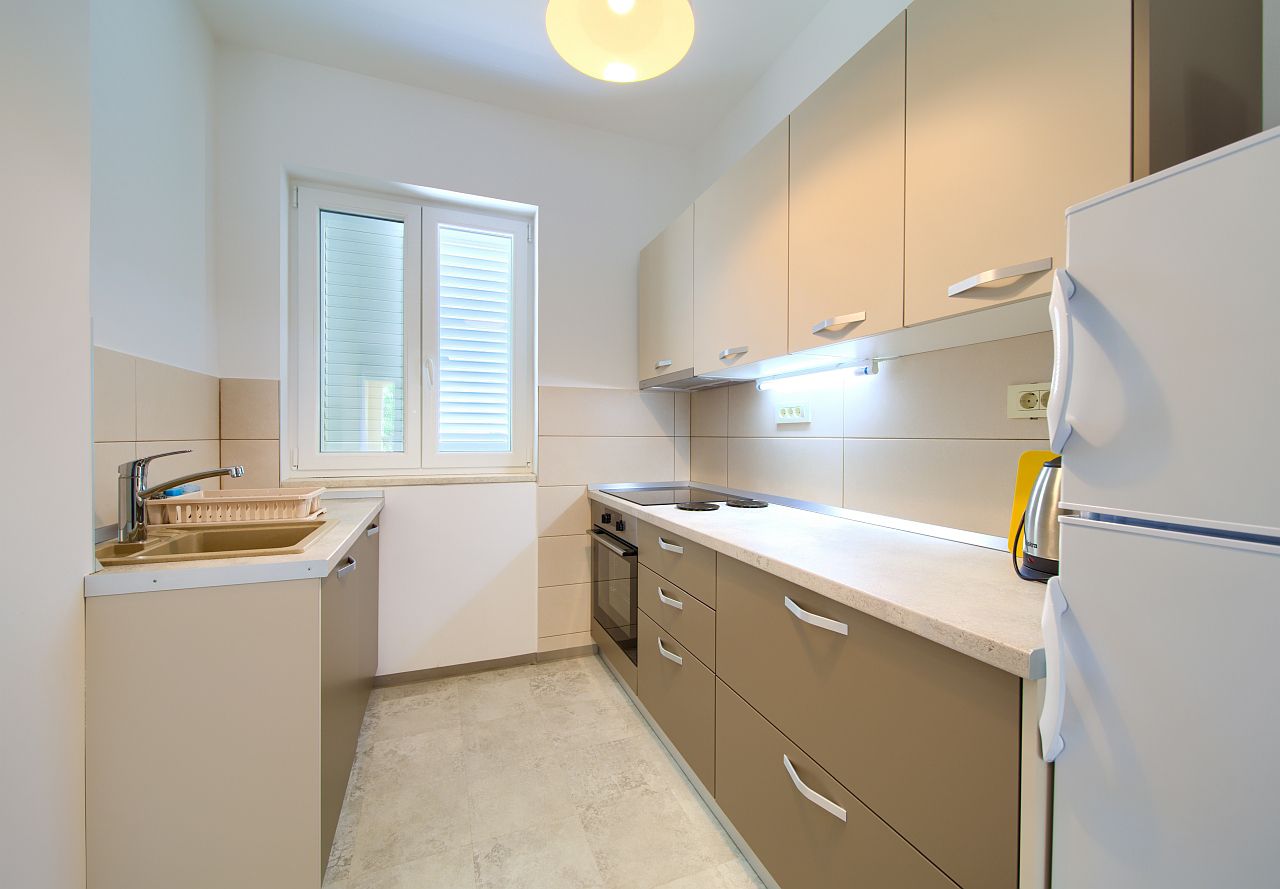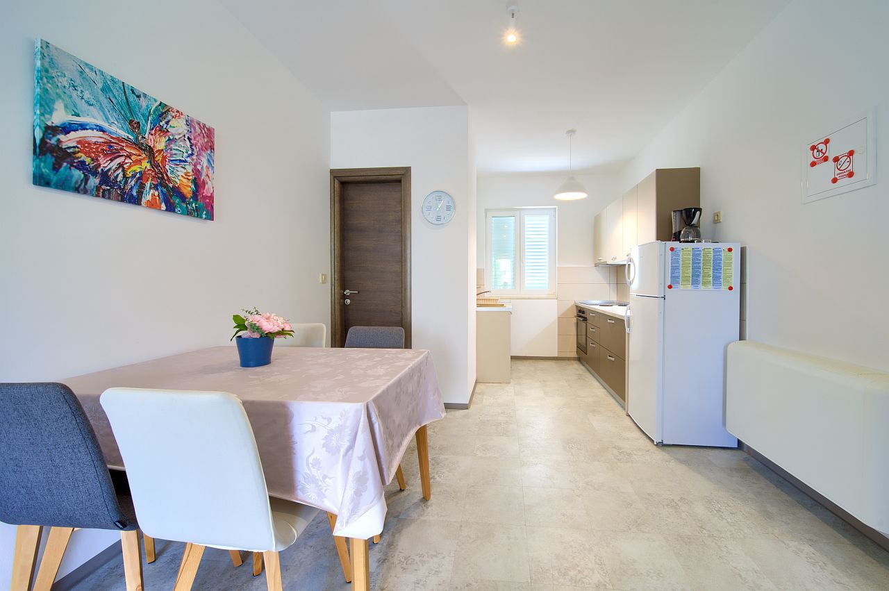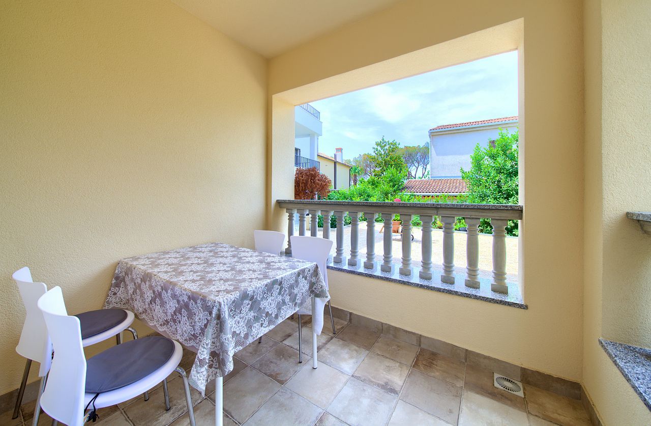 Apartment of 40m2, located on the ground floor. It has a bedroom with double bed, equipped kitchen, living room, bathroom and terrace facing the sea. In the living room there is an extra bed for two people.